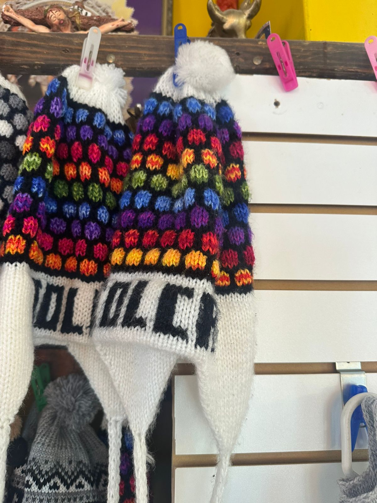 Standard knitted beanie featuring a white upper half and a heather grey folded lower brim. The word "COLCA" is prominently knitted in black across the grey band.